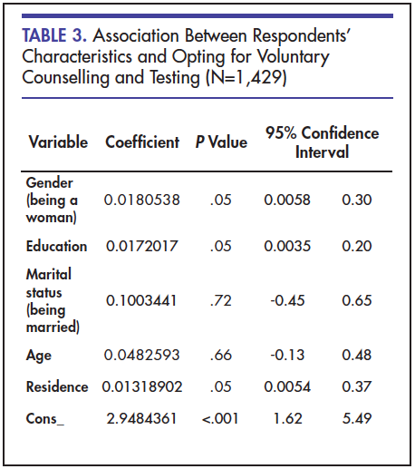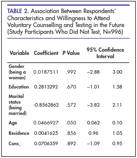 Results: There were 1,429 respondents from randomly selected households interviewed, and out of these, 57.1% were women, and 42.9% were men. The mean age of all respondents was 33.6 years; men were slightly older (mean age, 37 years) than women (mean age, 34 years). Almost one-third (n=433, 30.3%) of the respondents reported having ever tested for HIV, of whom 294 (61.8%) were women, and 139 (38.2%) were men. Being educated to at least the primary school level, being an urban resident, and being female increased the probability of HIV testing by 1.7% (P<.001), 1.3% (P<.005) and 0.2% (P<.005) respectively. Further, for each year, one’s age increased the probability of positive future intentions to test for HIV increased by 0.4 % (P<.005). Education, residence and marital status were not significantly associated with future willingness to test. Fear of being stigmatised and discriminated was observed to be one of the important barriers for HIV testing among those who had never tested and those who were unwilling to test in the future.