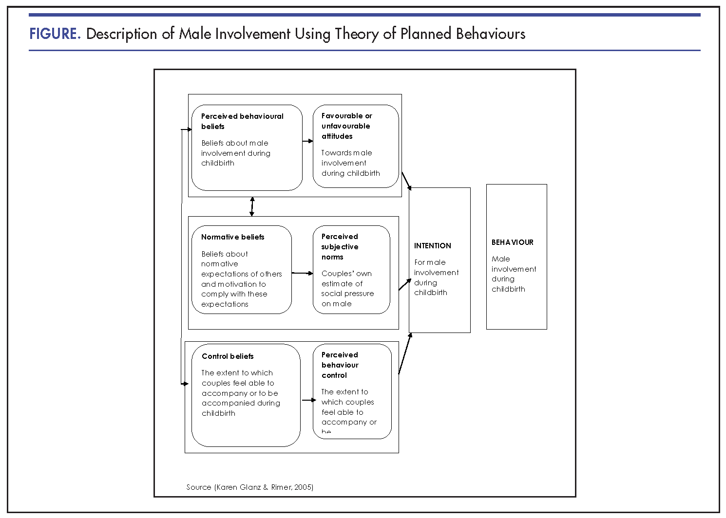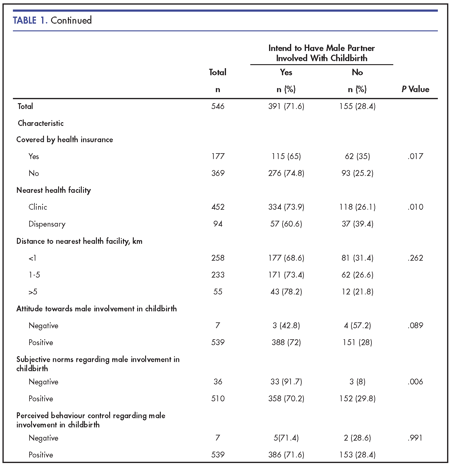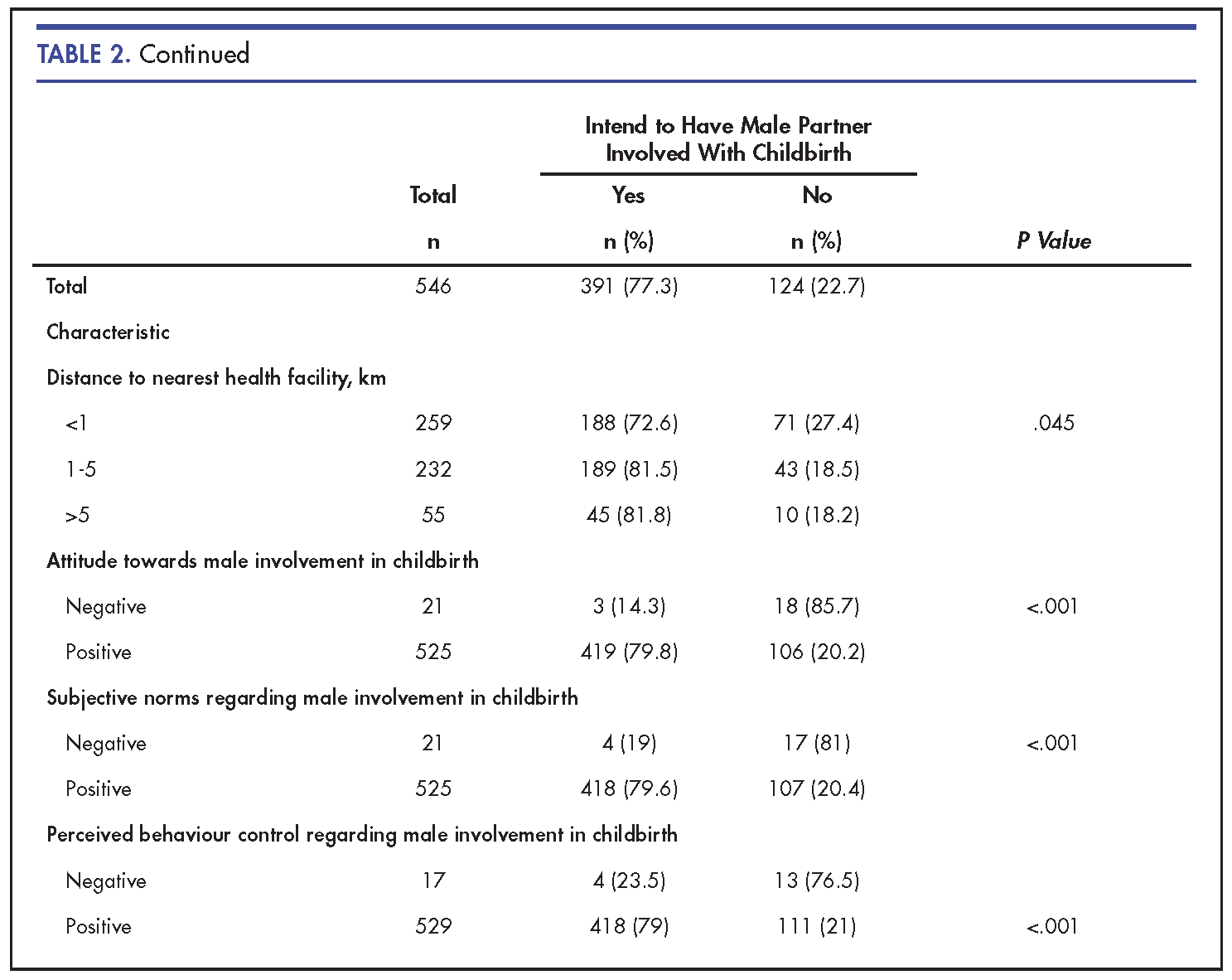 Conclusion: More male partners had the intention to accompany their spouses during childbirth compared to their female partners. Male attitudes and subjective norms may be influential in determining male involvement during childbirth in rural African settings.