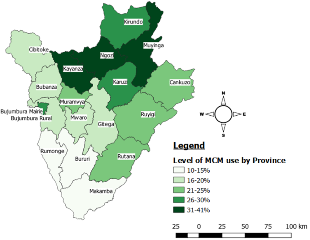 Results: Of the 9,945 women, 2,372 (23.8%) were using MCM. Ngozi province had the highest prevalence of MCM users [284/691(37.7%)]. The most used MCM among respondents was injectable contraceptive (48.3%). As respondent’s age increases, the odds of using MCM decreases; 20-24 years (aOR=0.9, 95% CI [0.6-1.2]), 30-34 years (aOR=0.8, 95% CI [0.5-1.0]), 35-39 years (aOR=0.7, 95% CI [0.5-0.9]), 40-44 years (aOR=0.5, 95% CI [0.5-0.9]) and 45-49 years (aOR=0.4, 95% CI [0.2-0.5]) compared with those in the age group 15-19 years. Muslims (aOR=1.5, 95% CI [1.2-1.9]) and Jehovah witnesses (aOR=3.1, 95% CI [1.7-6.5]) were more likely to use MCM than Catholics.