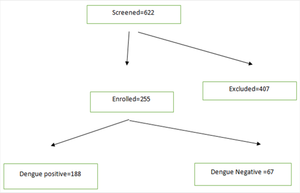 Results: A total of 255 patients were enrolled, whereby 188(73.7%) were dengue positive and 67 (26.3%) were negative. Dengue patients had relatively low mean total white blood cell counts compared to non-dengue patients (Student’s test= -2.7; p value=.007). Furthermore, Mean lymphocyte count was significantly low in dengue patients compared to non-dengue patients (Student’s (t) test=-5.1; p<.001). Other haematological parameters were not significantly different. Lymphopenia was a significant predictor for dengue positive results (Adjusted Odd Ration =5.26 (95% CI=2.28-12.2; P value <.001).