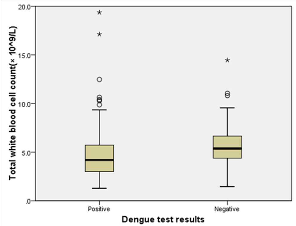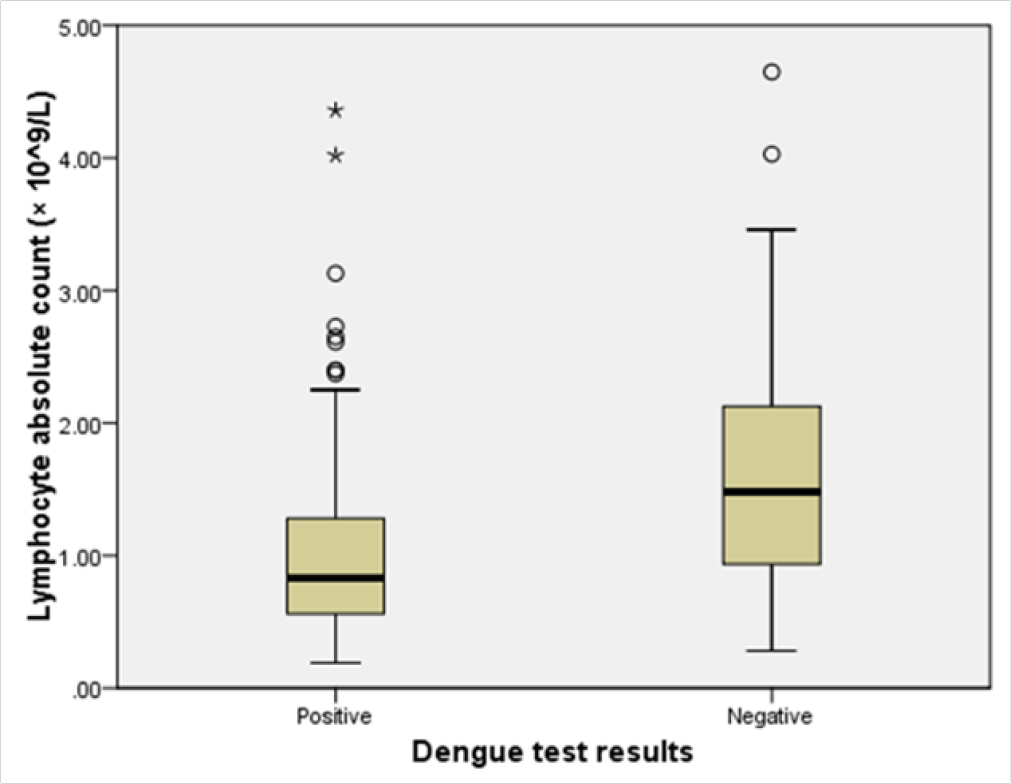Conclusion: Patients with dengue had significantly low total white blood cell and lymphocyte count compared to non-dengue febrile patients. Lymphopenia is a significant haematological predictor for dengue positive results. Case defining signs and symptoms combined with these haematological changes may be used by clinicians as a guide to order confirmatory test for suspected dengue cases.
