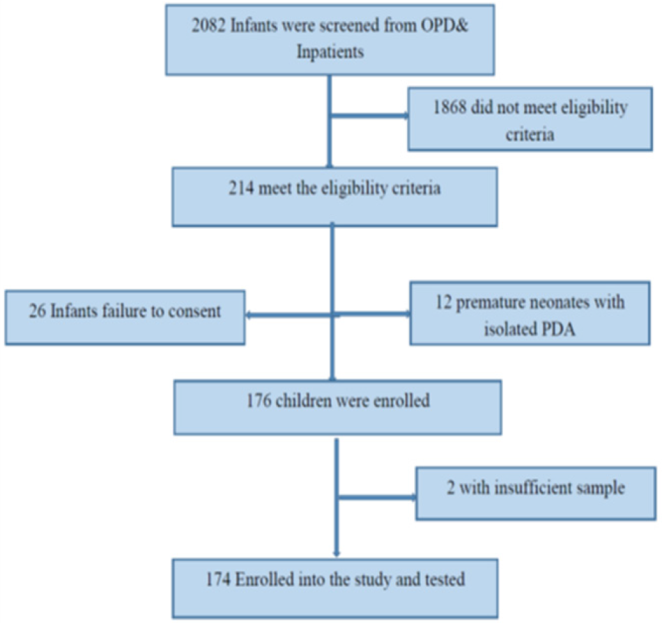 Methods: This cross-sectional study included 174 infants aged ≤ 12 months with at least one clinical features of CRS. The study was conducted between Septembers 2017and March 2018 at Bugando Medical Centre, a consultant teaching hospital in North Western Tanzania. Collection of Social demographic and other relevant information was done hand in hand with screening for clinical symptoms suggestive of CRS and Blood samples were collected. Indirect enzyme-linked immunosorbent assay (ELISA) Test were conducted on collected sera to test for specific Rubella IgM and IgG antibodies.