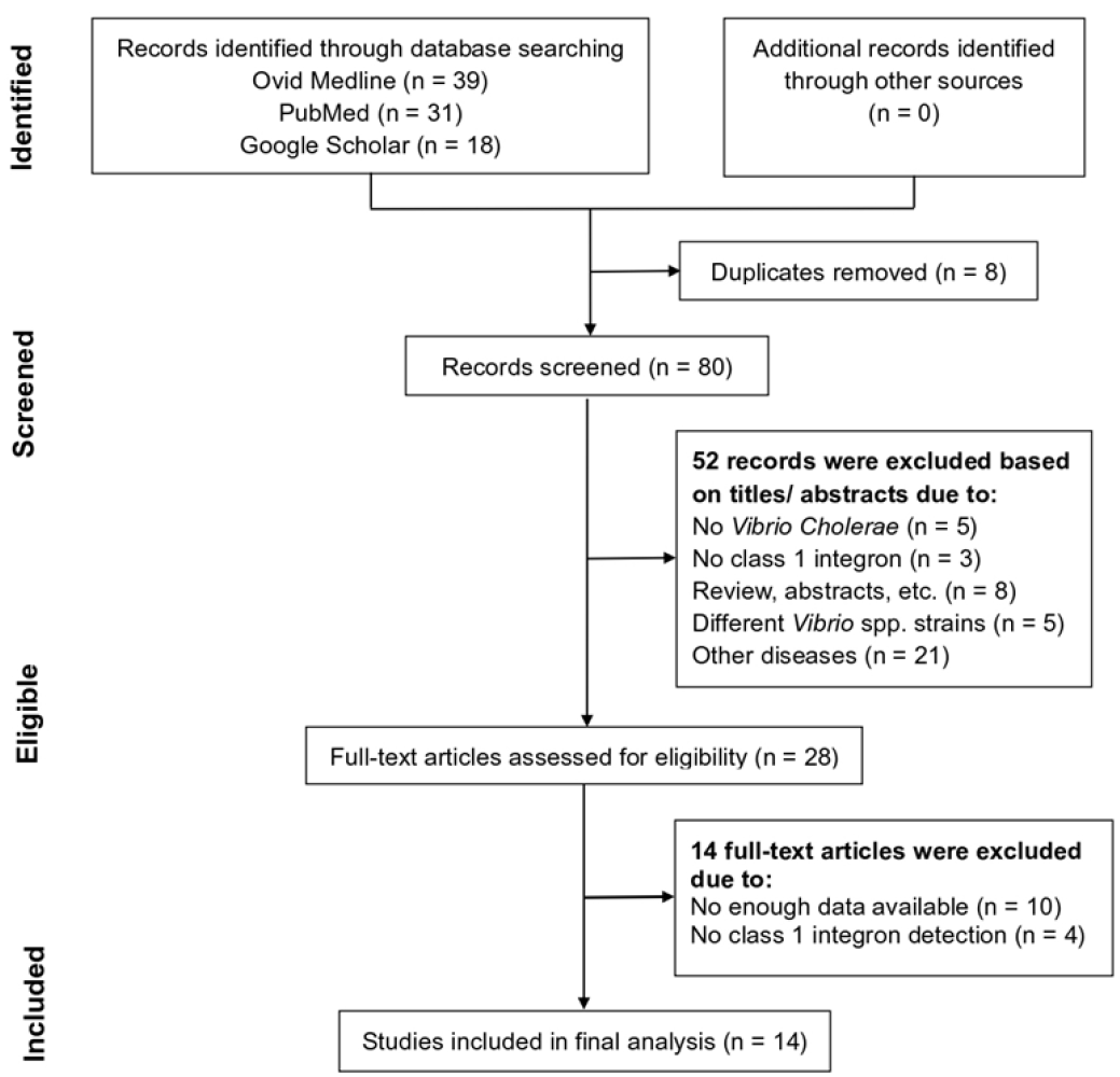 Methods: An intensive literature search of electronic databases for relevant studies from their starting dates up to April 2019 was conducted by two independent investigators. The electronic databases included; PubMed, Ovid Medline and Google Scholar databases. Only studies that determined antibiotic resistance conferred by class 1 integron in V. cholerae strains isolated from clinical and/or environmental samples using Polymerase Chain Reaction (PCR) assay were included in this study.