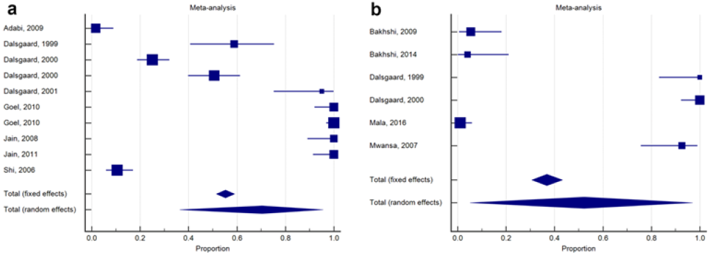 Results: The random-effects model was selected and performed for all the studies included in this meta-analysis. Fourteen studies consisting of both qacEΔ1 and sul1, and int1 in the class 1 integron of V. cholerae strains were included. The proportions of class 1 integron 3’-CS and 5’-CS were 70.4 % (95%CI: 37.5–94.4) and 52 % (95% CI: 6.3–95.7) respectively.
