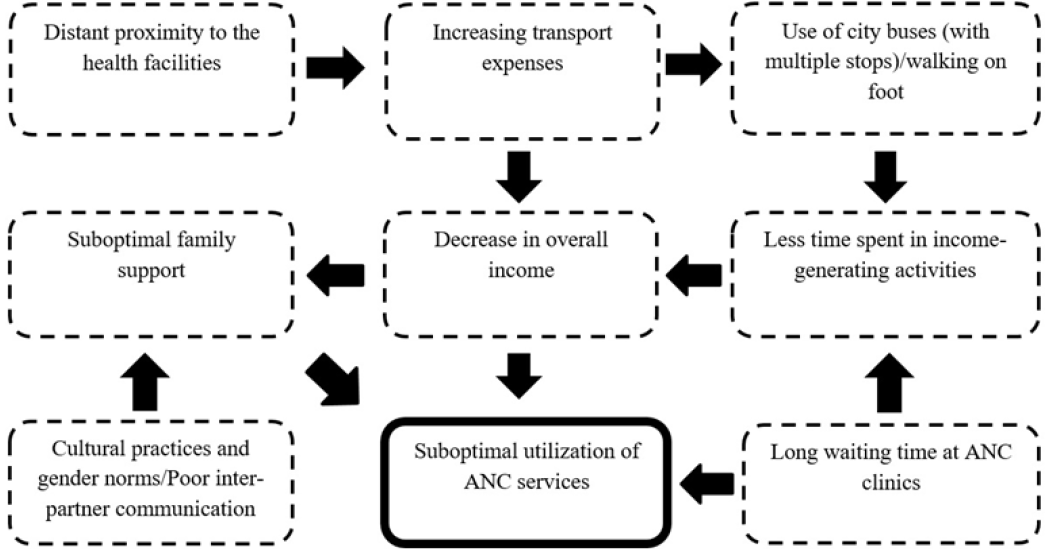 Recommendations: Public and private sectors should invest in maternal health, provide affordable services and formulate strategies to improve the accessibility of ANC services. Interventions should target women of low socio-economic class and those living in remote areas. Moreover, schemes to address the sociocultural barriers to ANC utilization need to be formulated.