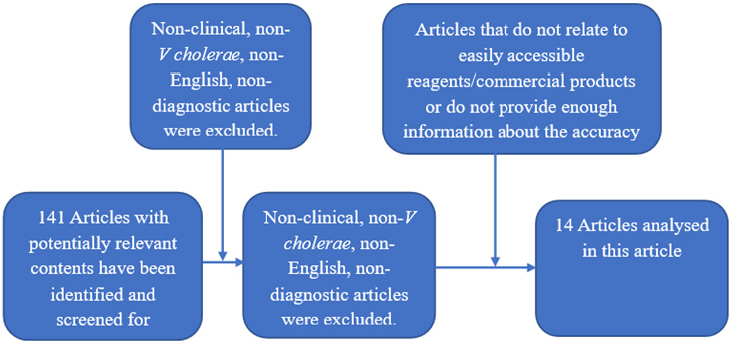 Methods: A systematic review was conducted to evaluate the development and performance of cholera rapid diagnostic techniques for detecting cholera in clinical samples and for environmental surveillance purposes over the past decade.