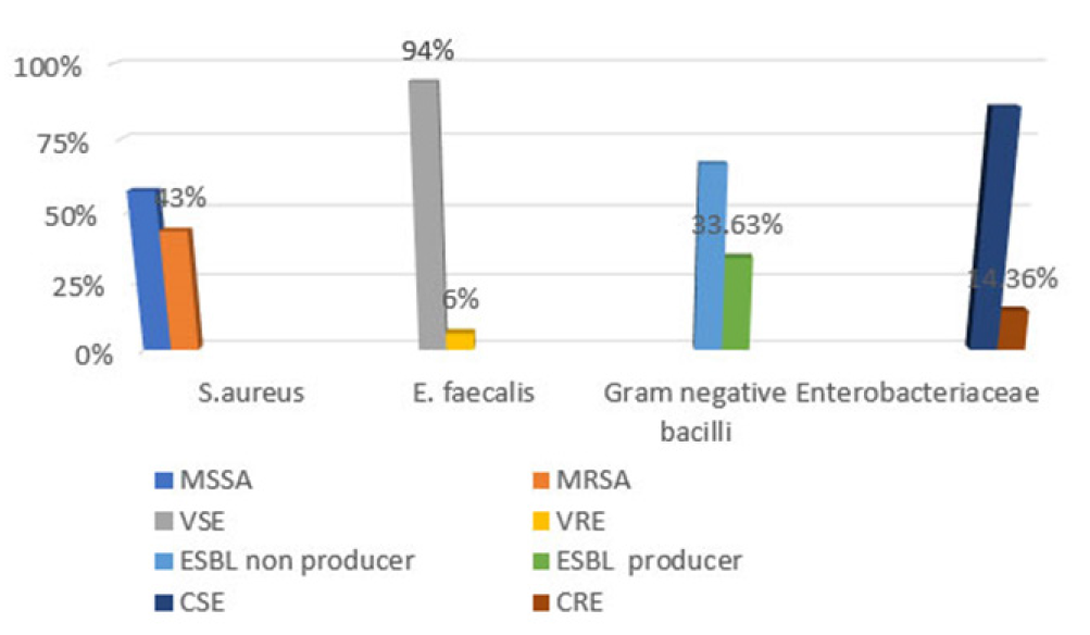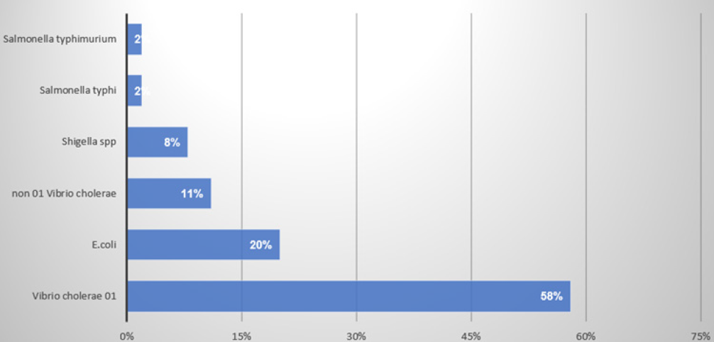 Results: Only 38% of healthcare workers sanitize their handsets during or after work. The most common mobile phone bacterial isolate was Enterococcus faecalis (28.95%) followed by Staphylococcus aureus (18.42%). 58% of stool sample isolates were Vibrio cholera 01 serotype followed by Escherichia coli 0157.H7 (20%). Methicillin-resistant Staphylococcus aureus (43%) and Vancomycin Resistant Enterococcus (6%). BlaVIM was the most commonly detected gene from five isolates, including Vibrio cholera 01