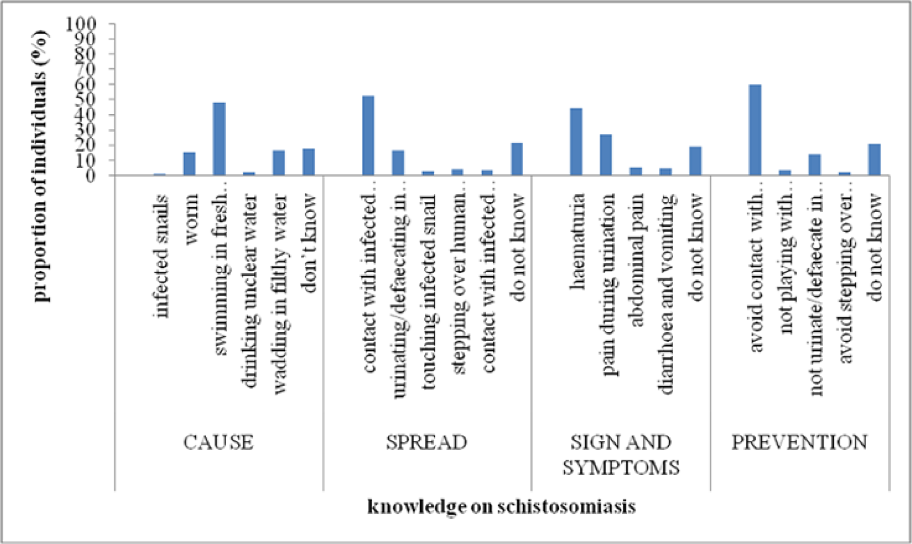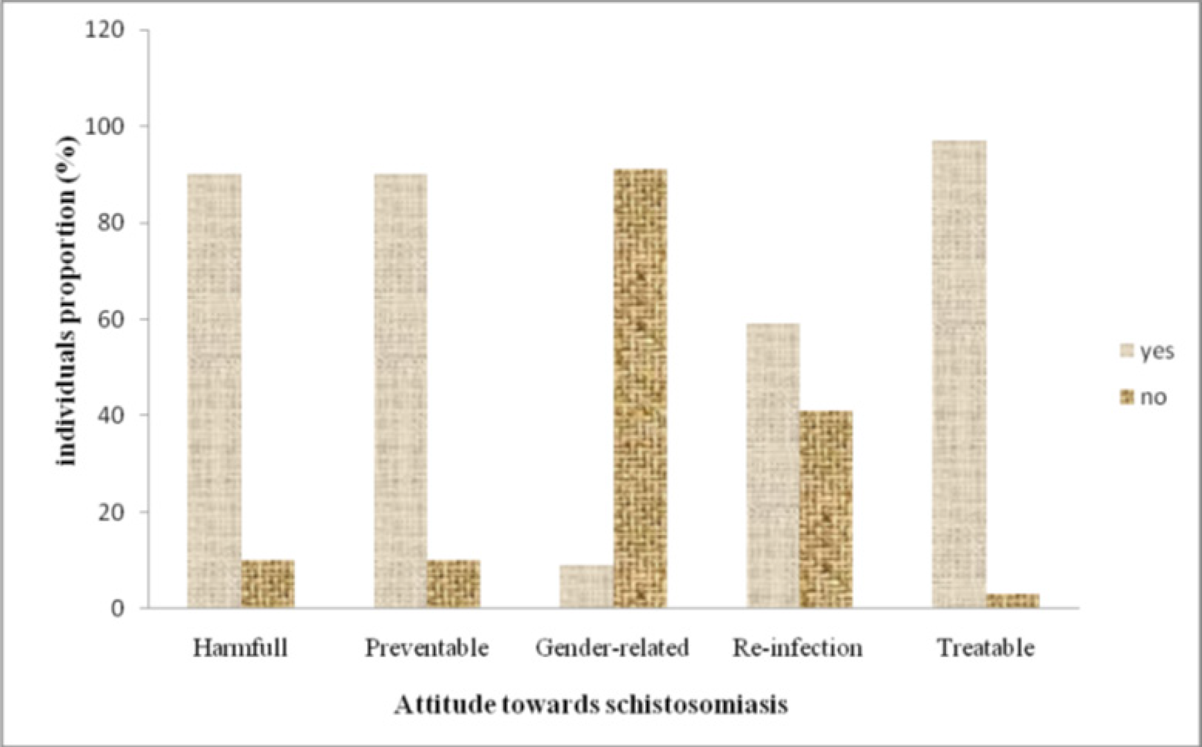 Results: Most participants demonstrated awareness of schistosomiasis, including its transmission, symptoms and preventive measures, although they struggled to distinguish between urogenital and intestinal schistosomiasis. The majority displayed positive attitudes toward the disease, yet over half of them (59.1%) believed that the disease could not re-occur after initial treatment. Notably, older people were significantly less knowledgeable than their younger counterparts (ƴ2 = 41.982, df = 5, p = <.05) while farmers were also significantly more knowledgeable than other occupational groups like fishermen, livestock keepers and house wives (ƴ2 = 36.194, df = 4, p = .003).