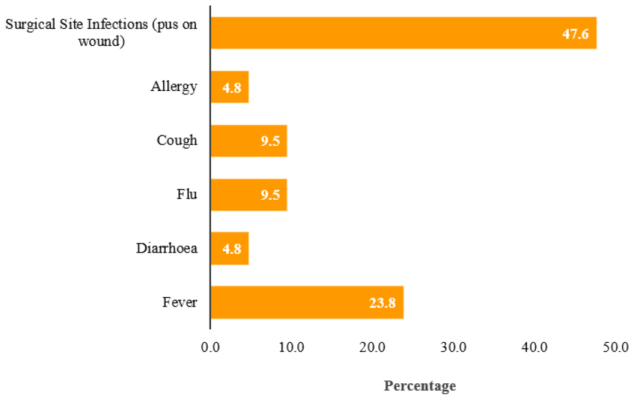 Methods: A cross-sectional, hospital based study was conducted among patients admitted to a tertiary care facility in Tanzania. A semi-structured questionnaire was used to collect information from 134 patients in different wards. Correlation and multivariate regression analyses were performed to determine the association between the independent variables, i.e. chronic illness, invasive procedures, use of antibiotics and referral status, and the dependent variable, i.e. new symptom, and their level of significance. The significance level was set at P≤ .05.