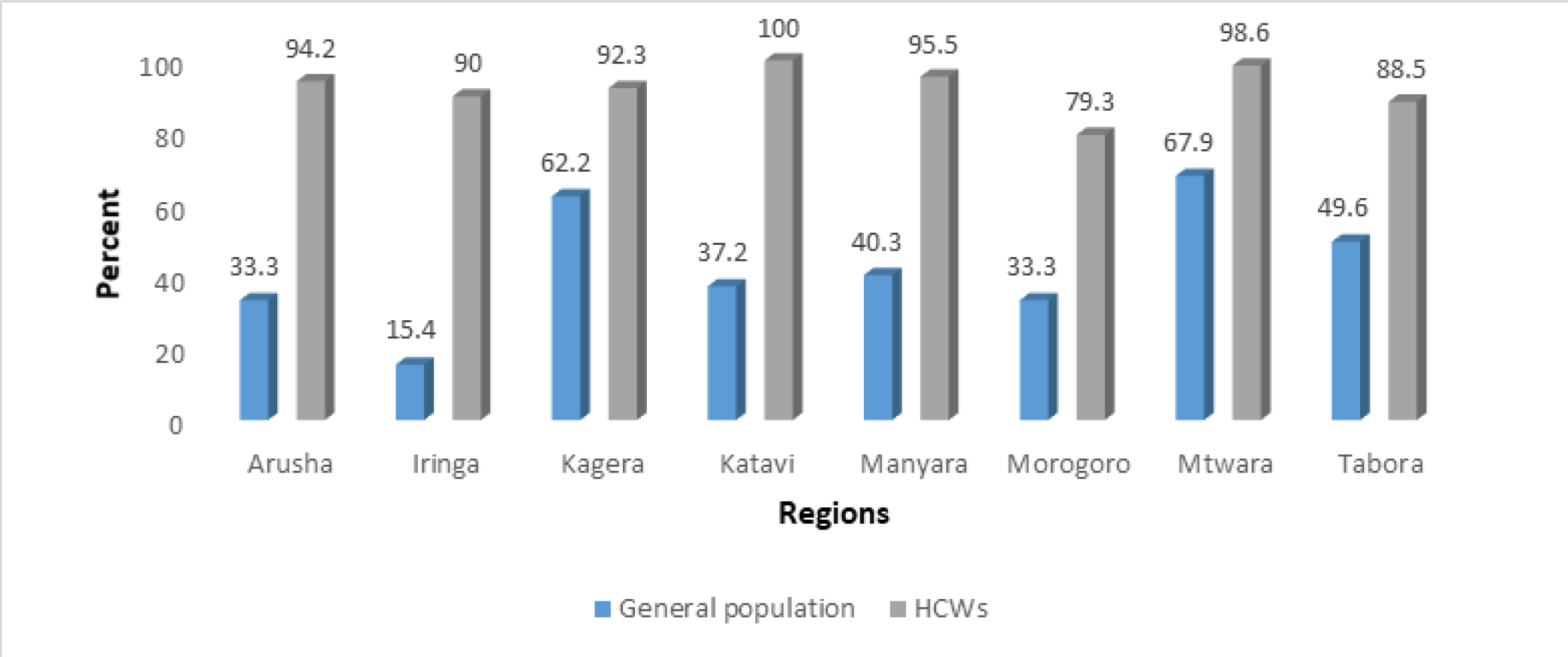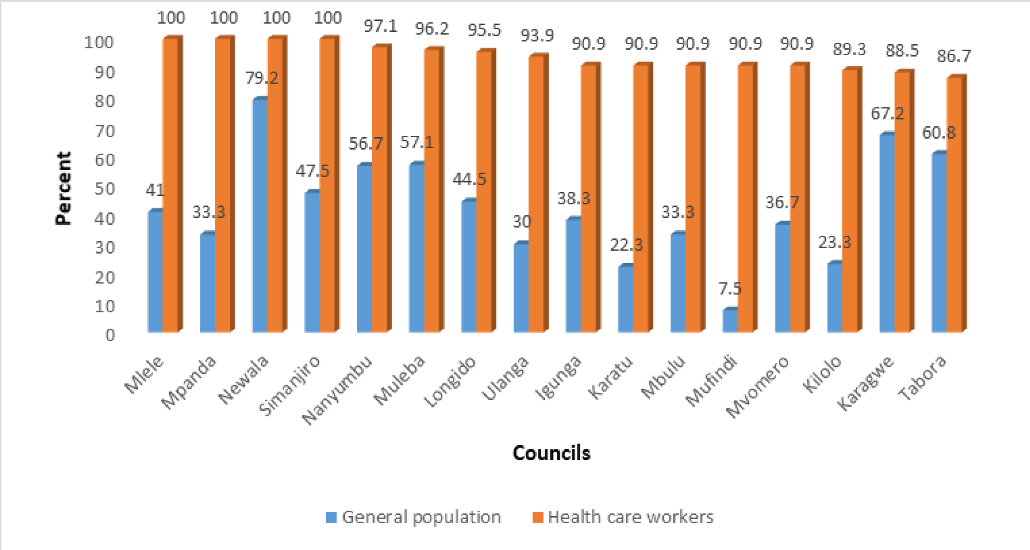 Methods: A cross sectional study was conducted in 16 councils which included; Milele, Mpanda, Newala, Simanjiro, Nanyumbu, Muleba, Longido, Ulanga, Igunga, Mbulu, Karatu, Mufindi, Mvomero, Kilolo and Tabora Town. A total of 427 health care workers and 1,907 individuals were sampled from health facilities and households. Structured questionnaires were used to collect the required information.