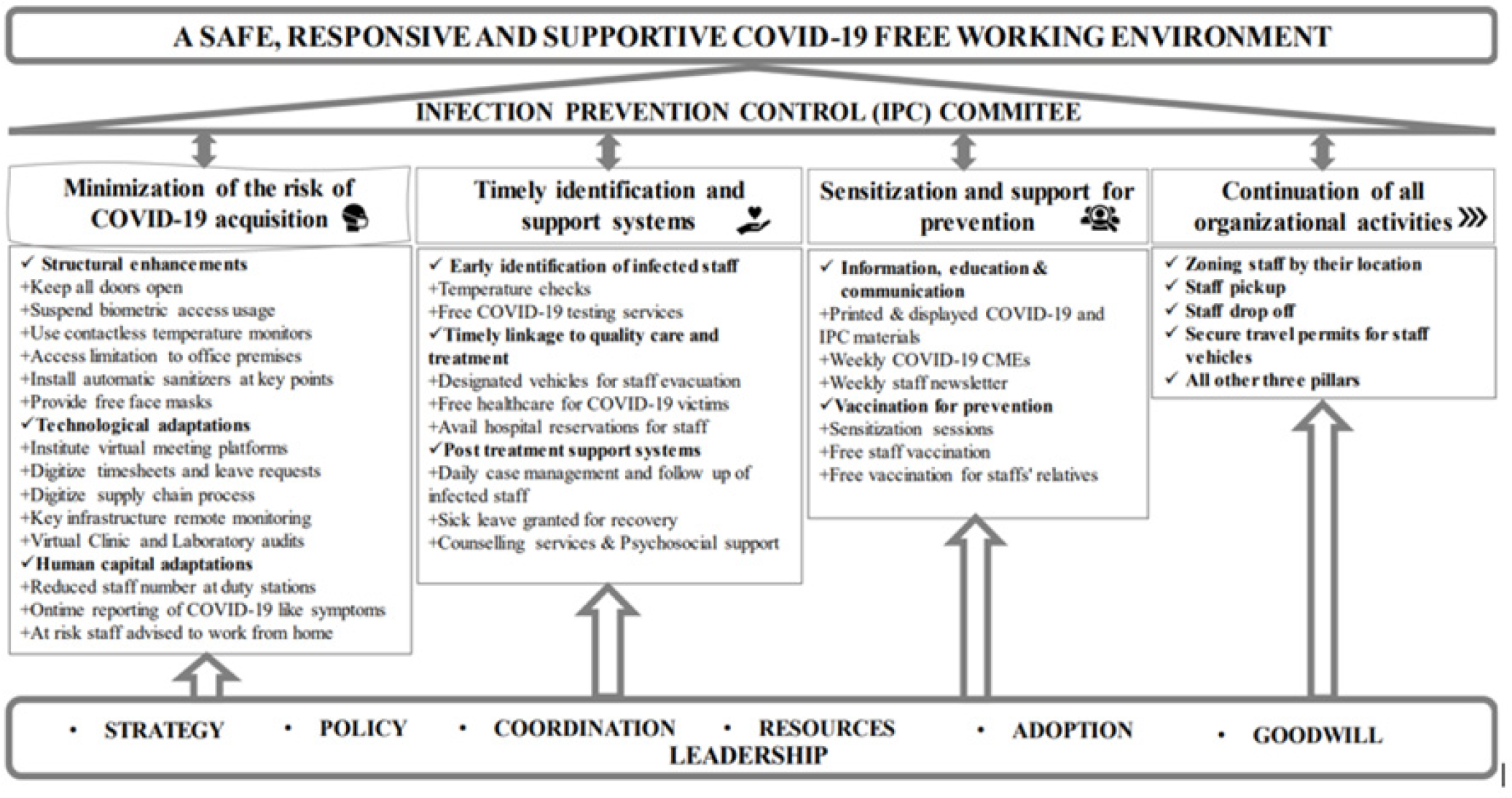 Not for profit health organisations (NPHOs) complement government health response efforts, hence the need for their continued functionality during pandemic situations. In this article we highlight lessons from Makerere University Walter Reed Project’s (MUWRP) efforts to ensure continuity of its health mandate during the corona virus disease 2019 (COVID-19) outbreak. Our findings provide cues for other developing world NPHOs as they prepare for the next outbreak. When the first case of COVID-19 was reported in Uganda, MUWRP’s leadership identified four strategic pillars of action; minimising the risk of spread of the malady, ensuring continuity of all health activities, early identification and support for casualties, and prevention. An infection prevention and control (IPC) committee was set up to lead response efforts. Innovations per pillar such as adoption of information technology to ensure virtual working and meeting, bringing vaccines to the doorsteps of interested staff, free COVID testing, alternate employee working schedules, introduction of temperature guns, and weekly IPC review meetings were implemented. Routine demographic, testing, positivity, and treatment data was exported to STATA 15.1 for analysis. By the declaration of the end of the pandemic by the WHO, the average positivity rate of COVID-19 among 196 MUWRP staff was 7%, with 95% of all cases being mild, and 94.3% cases managed through home-based care. Only three cases were referred to hospital. Overall, males 30 to 40 years were most affected. Vaccination completion was at 89%, and there were no fatalities reported. Employing the four pillars and related innovations were key to minimising the effects of COVID-19 at MUWRP and are a relevant adaptable tool for other NPHOs in the developing world, as they prepare for the next pandemic.