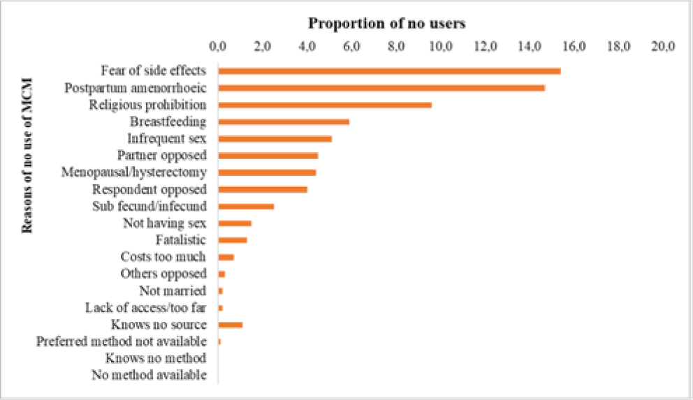 Results: Of the 9,945 women, 2,372 (23.8%) were using MCM. Ngozi province had the highest prevalence of MCM users [284/691(37.7%)]. The most used MCM among respondents was injectable contraceptive (48.3%). As respondent’s age increases, the odds of using MCM decreases; 20-24 years (aOR=0.9, 95% CI [0.6-1.2]), 30-34 years (aOR=0.8, 95% CI [0.5-1.0]), 35-39 years (aOR=0.7, 95% CI [0.5-0.9]), 40-44 years (aOR=0.5, 95% CI [0.5-0.9]) and 45-49 years (aOR=0.4, 95% CI [0.2-0.5]) compared with those in the age group 15-19 years. Muslims (aOR=1.5, 95% CI [1.2-1.9]) and Jehovah witnesses (aOR=3.1, 95% CI [1.7-6.5]) were more likely to use MCM than Catholics.