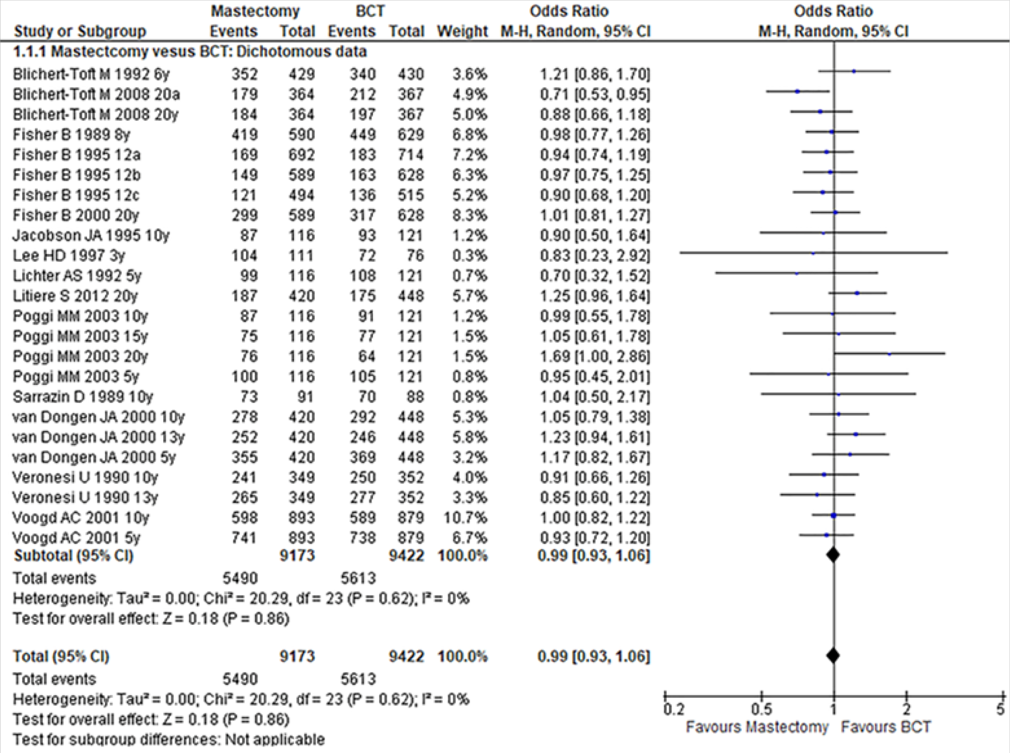 Results: Using dichotomous data, there was no significant difference between mastectomy and BCT(OR:0.99; 95% CI:0.93-1.06; P:0.86). This was the same in subgroup analysis based on period of follow up. Their ORs and CI were (OR:0.97; 95% CI:0.81-1.18; P:0.79), (OR:1.01; 95% CI:0.90-1.13; P:0.87) and (OR:1.04; 95% CI:0.93-1.16; P:0.46) respectively for up to 5 years or less, between 5 and 10 years and more than 10 years of follow up.