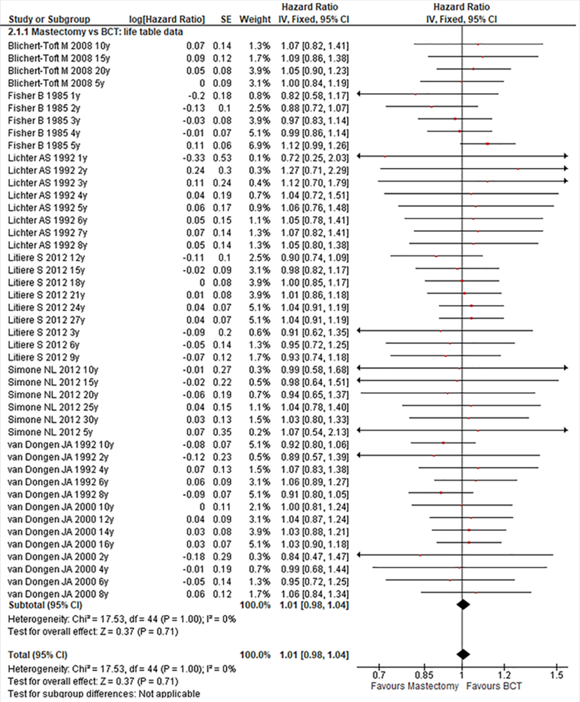 Using generic inverse variance, there was no significant difference between mastectomy and BCT, (HR:1.01; 95% CI:0.98-1.04; P:0.71). In subgroup analysis based on period of follow up, there was no significant difference between mastectomy and BCT. Their HRs, CI and P-value were (HR:1.01; 95% CI:0.951-1.07; P:0.79), (HR:0.98; 95% CI:0.92-1.04; P:0.51) and (HR:1.02; 95% CI:0.97-1.07; P:0.40) respectively for up to 5 years or less, between 5 and 10 years and more than 10 years of follow up.